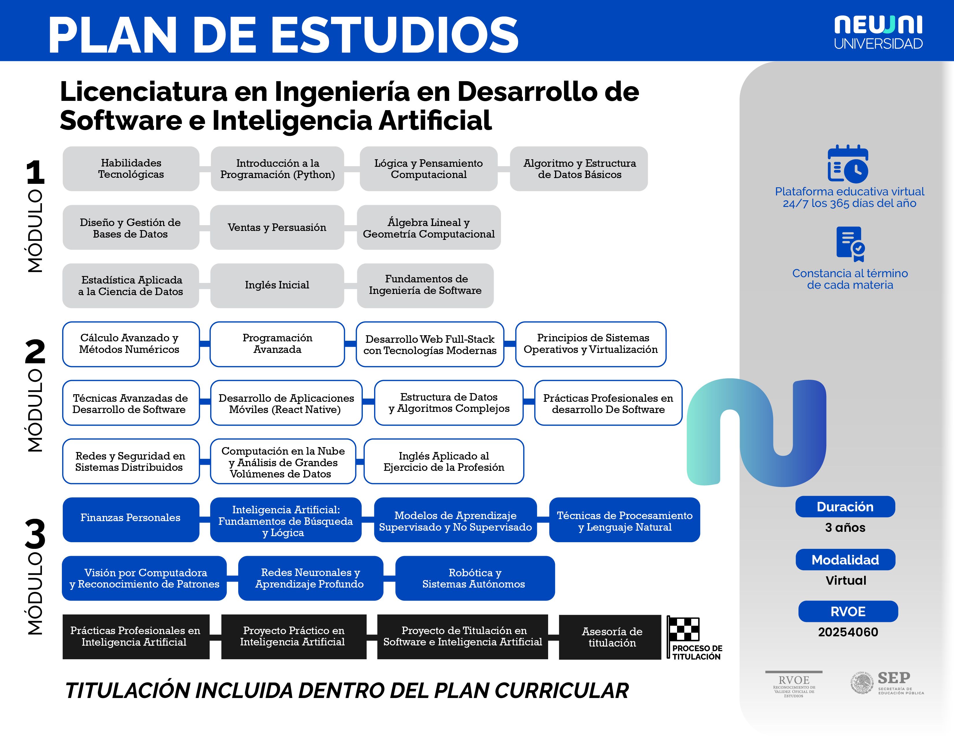 La Licenciatura en Ingeniería en Desarrollo de Software e Inteligencia Artificial forma a los líderes tecnológicos que están transformando el presente y construyendo el futuro digital. Aquí no solo aprendes a programar: desarrollar la capacidad de diseñar, estructurar y escalar sistemas inteligentes que impactan empresas, industrias y mercados completos. Dominarás herramientas de alto nivel como Python para crear algoritmos de aprendizaje automático, automatizar procesos y desarrollar soluciones innovadoras, además de utilizar Power BI para convertir datos complejos en decisiones estratégicas que generan valor real. Este programa te prepara para destacar en la Industria 4.0 con una visión analítica, sistémica y orientada a resultados.